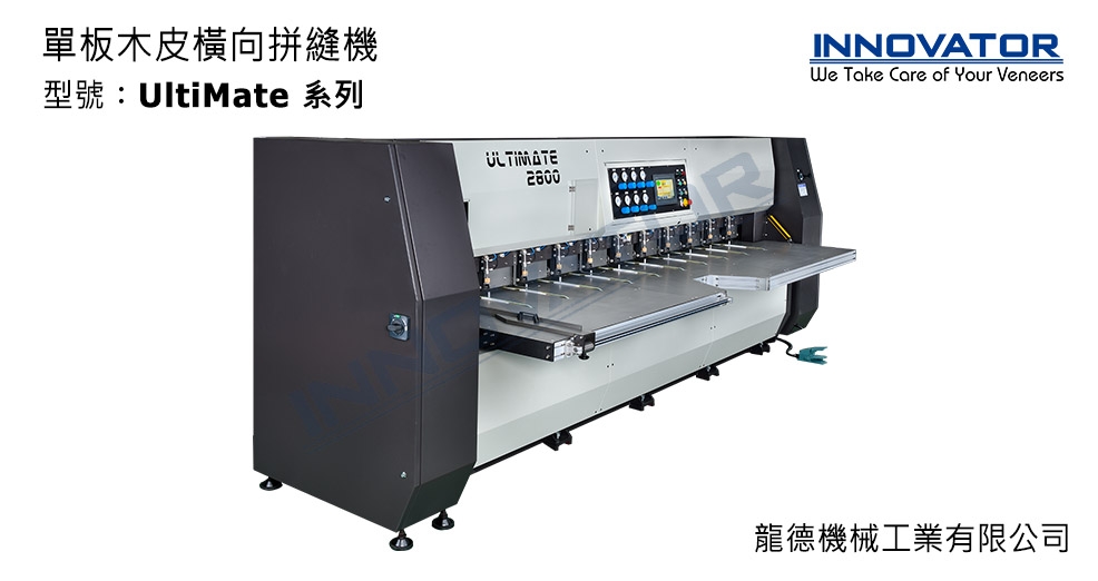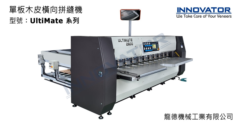 龍德公司之單板木皮「橫向」拼縫機 UltiMate 系列,是專為拼接長料單板木皮素材所設計。待拼接的單板木皮使用剪切機將拼接邊準確地剪成直線後,經過預塗膠(可用 PVAc 或尿素膠)的流程,即完成拼接前的準備動作。此單板木皮橫向拼縫機針對長料木皮之生產速度為縱向拼縫機種之數倍。龍德更提供自動堆疊系統(選購配備),讓客戶邁向自動化生產目標一大步。預塗膠之工序建議使用本公司生產的單板木皮雙刀剪切機 CutMate D 系列及單板木皮雙面自動塗膠機 GlueMate 700,如再搭配單板木皮展開機FanningMate,即可形成整套全自動木皮拼接生產線。